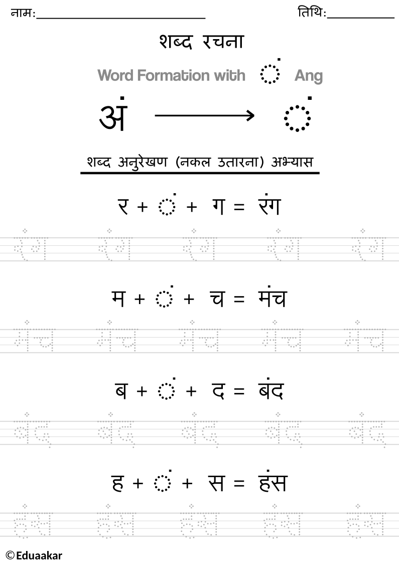 नीचे दी गयी वर्कशीट्स को आप डाउनलोड करके अं (अनुस्वार) की मात्रा का अभ्यास कर सकते हैं।